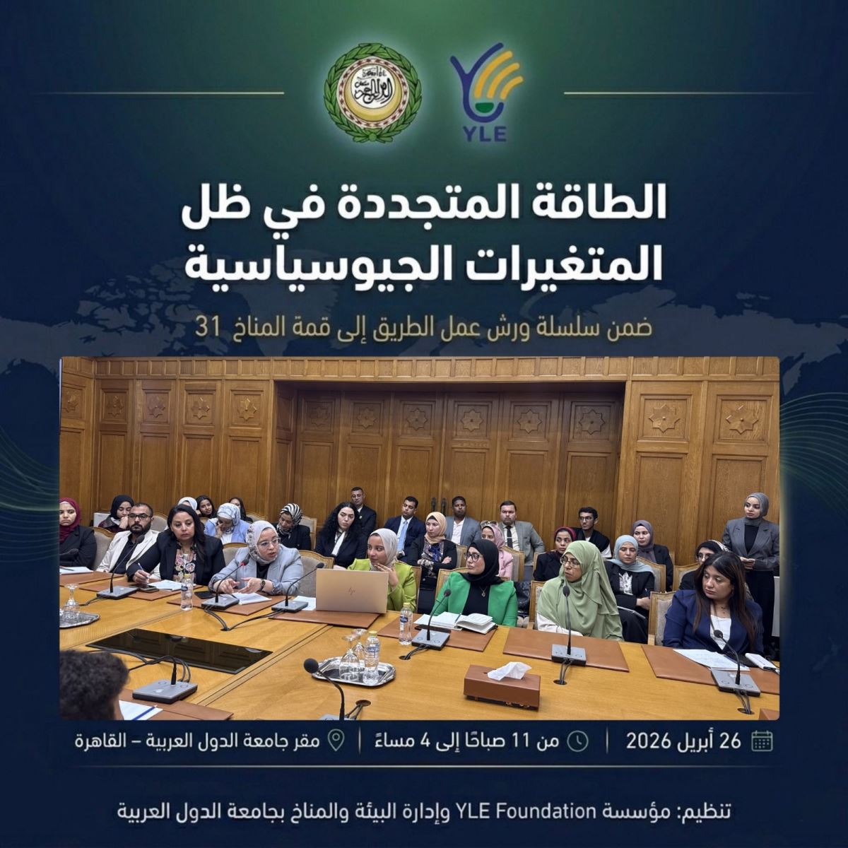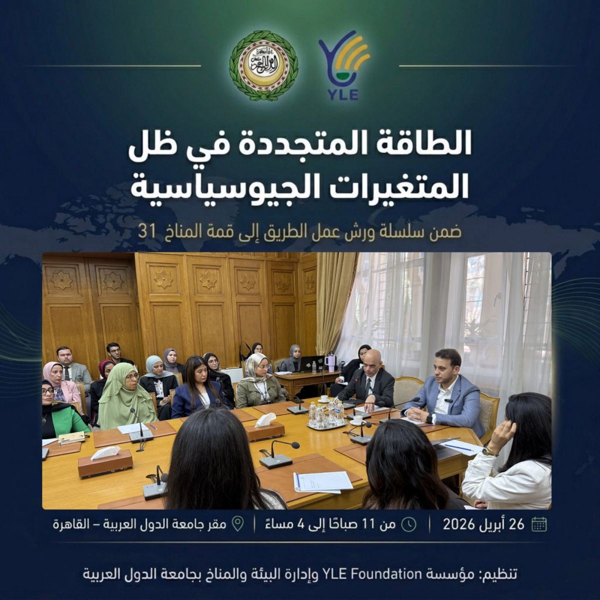 عُقدت الورشة تحت عنوان "الطاقة المتجددة في ظل المتغيرات الجيوسياسية: نحو موقف عربي متماسك قبيل انعقاد COP31"، بتنظيم مشترك من مؤسسة YLE Foundation وإدارة البيئة والمناخ بجامعة الدول العربية، وهي الورشة الثالثة ضمن مسار تحضيري ممتد، سيُتوَّج بإصدار كتاب سياسات شامل يُسلَّم للمفاوضين العرب قبيل قمة المناخ.